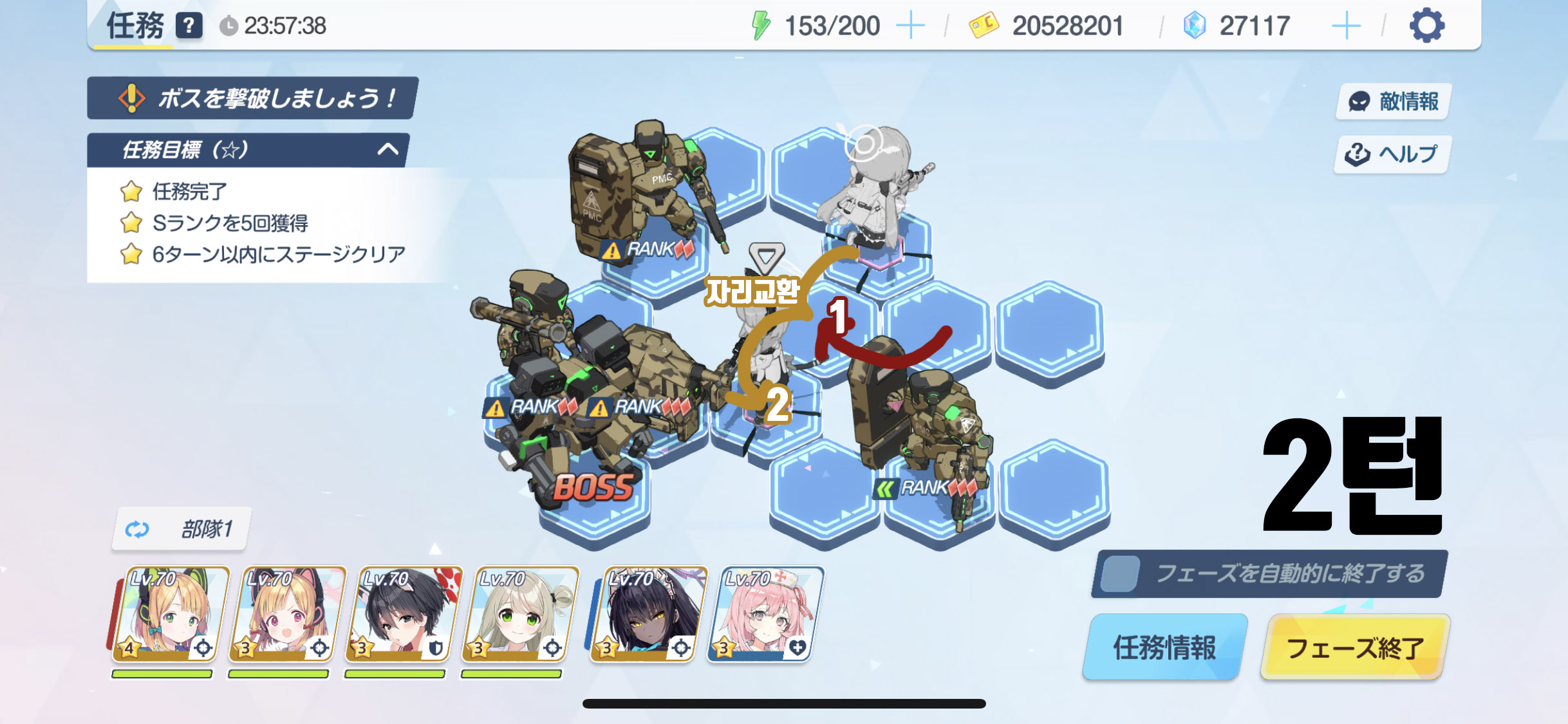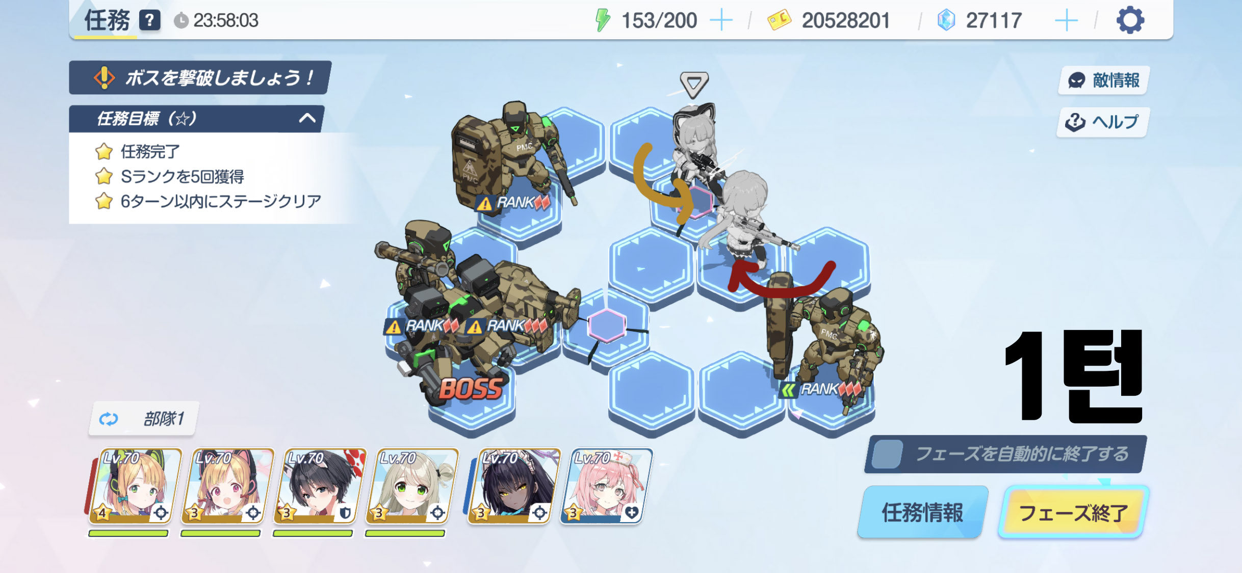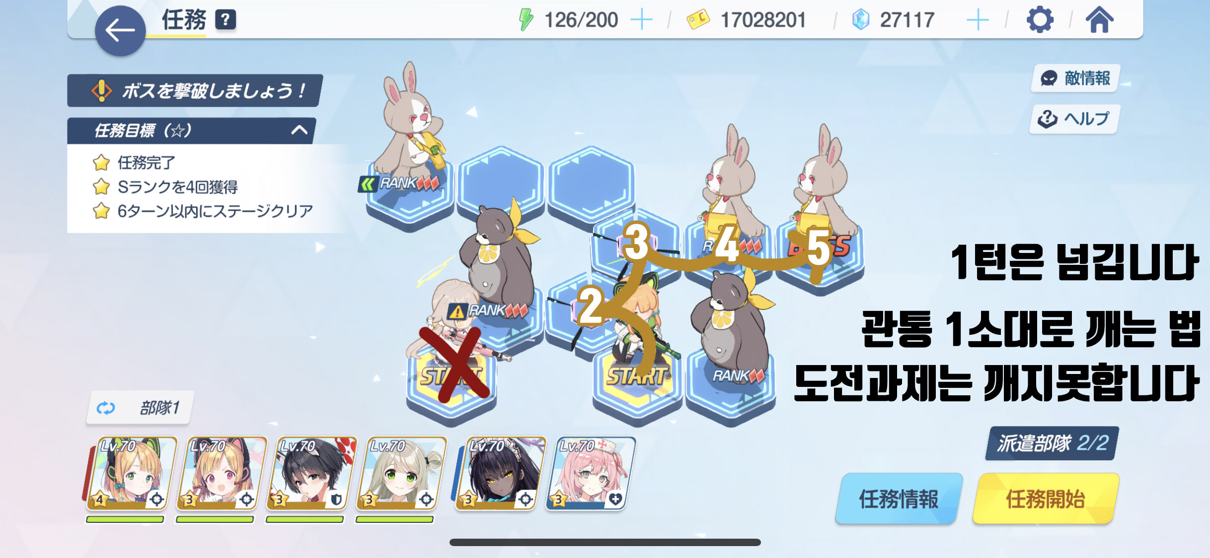 임무완료 / 전투 S랭크 5회 / 6턴 안에 스테이지 클리어