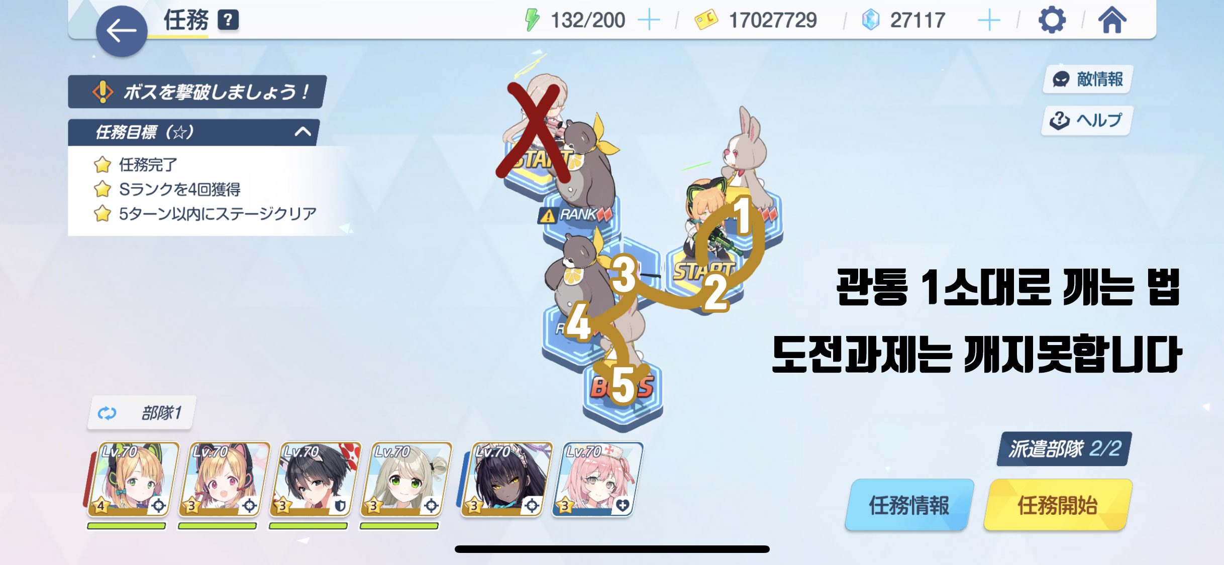 임무완료 / 전투 S랭크 5회 / 5턴 안에 스테이지 클리어