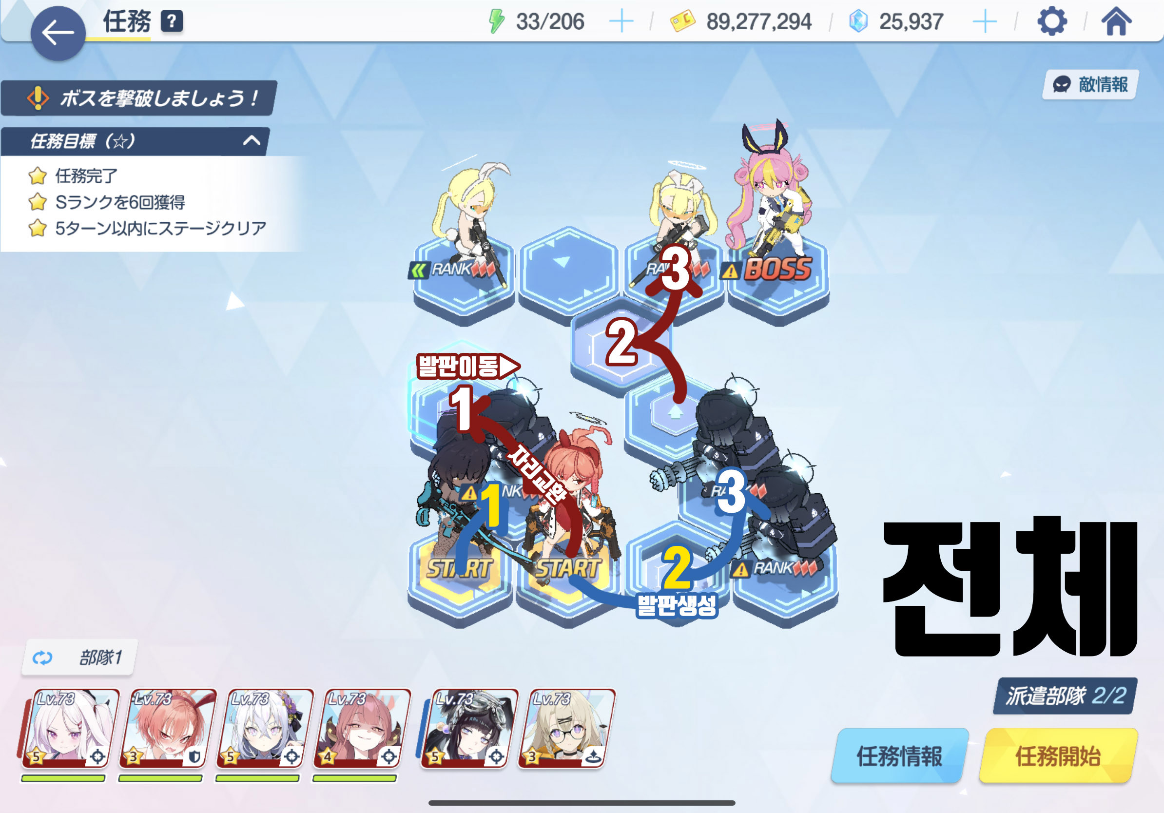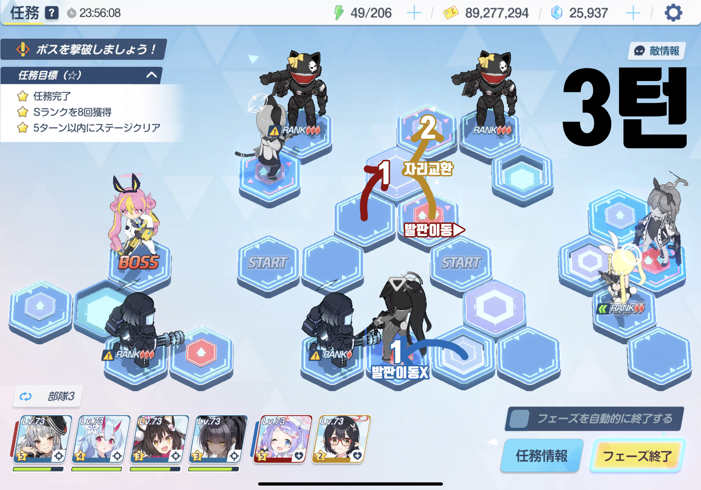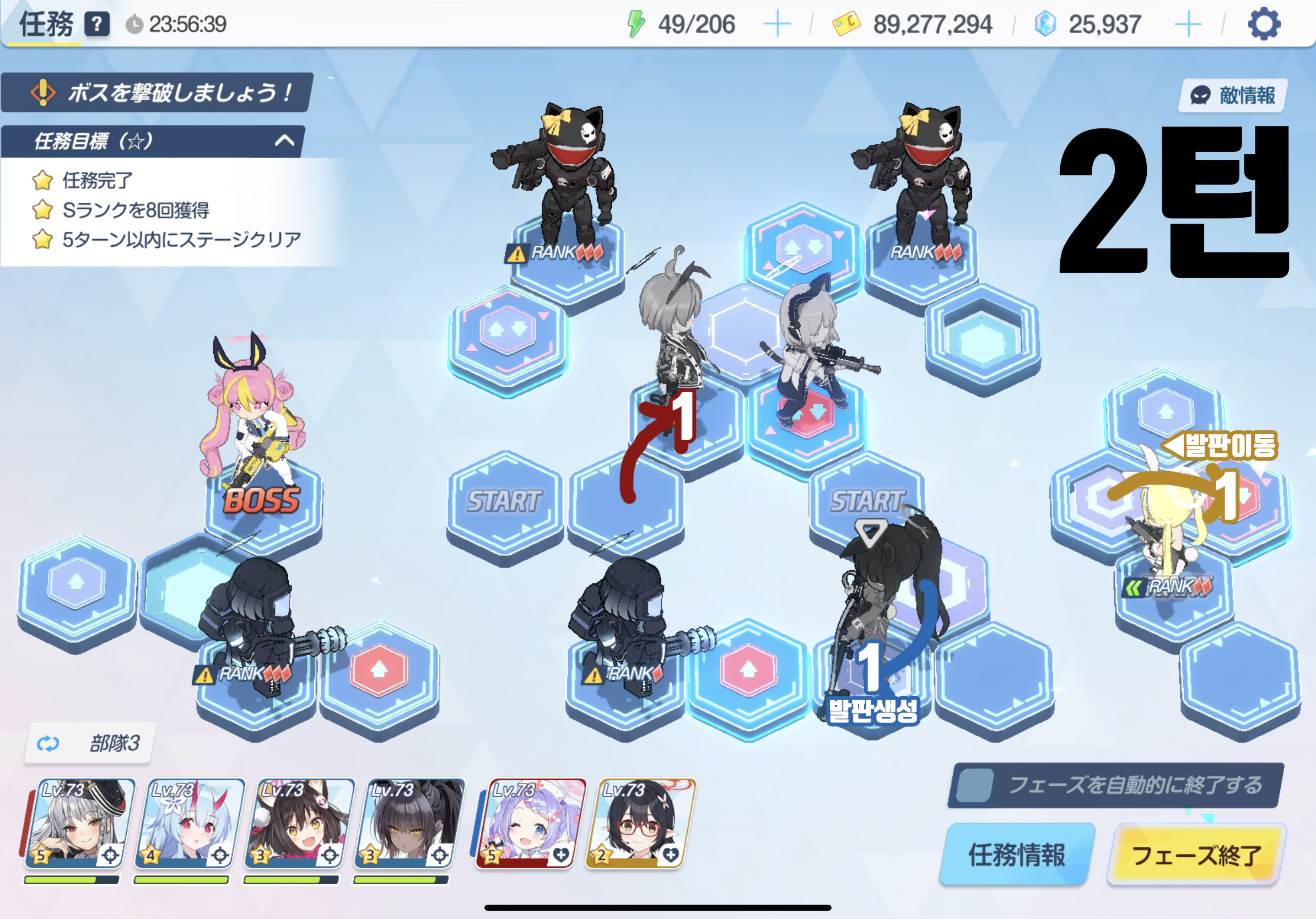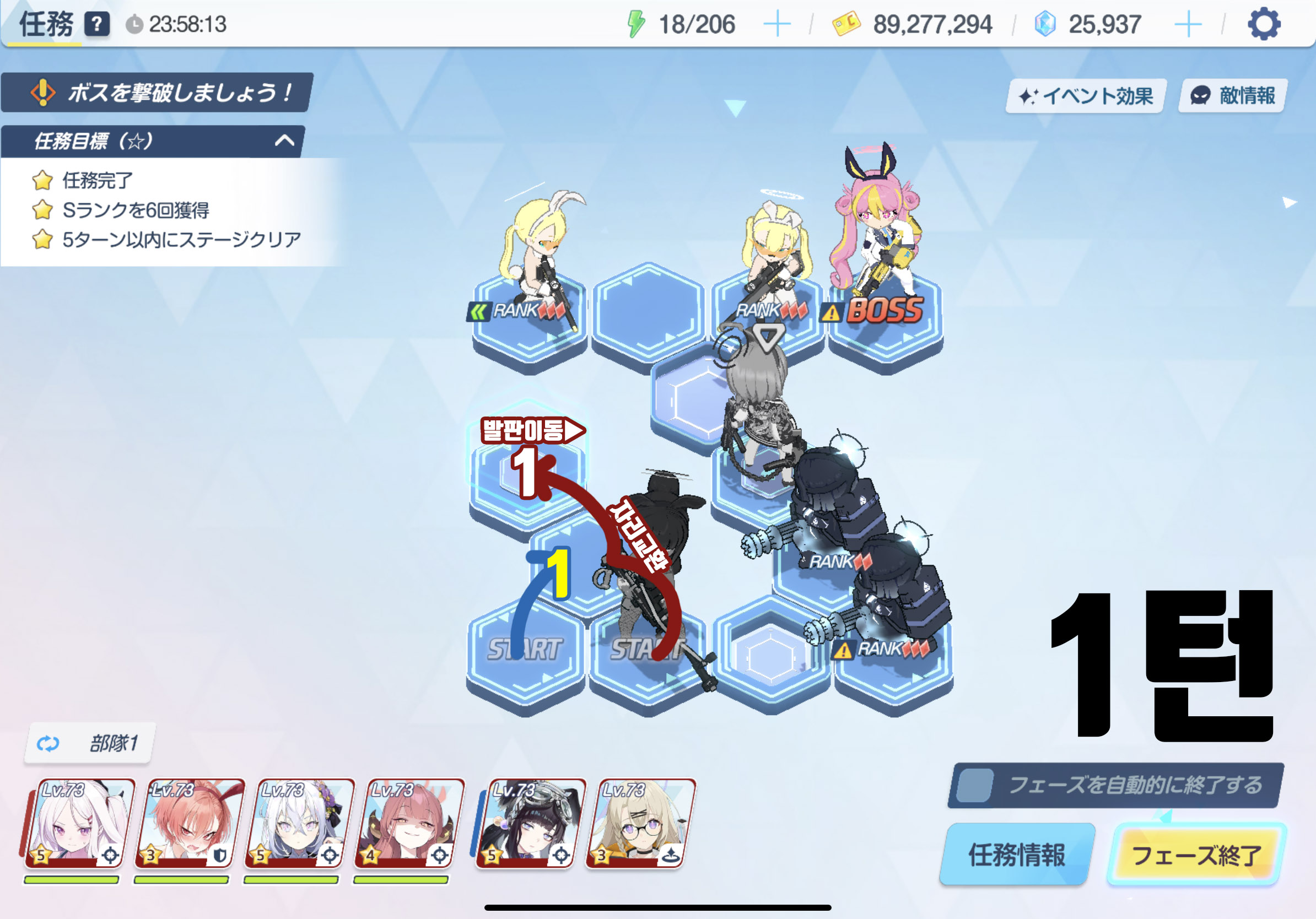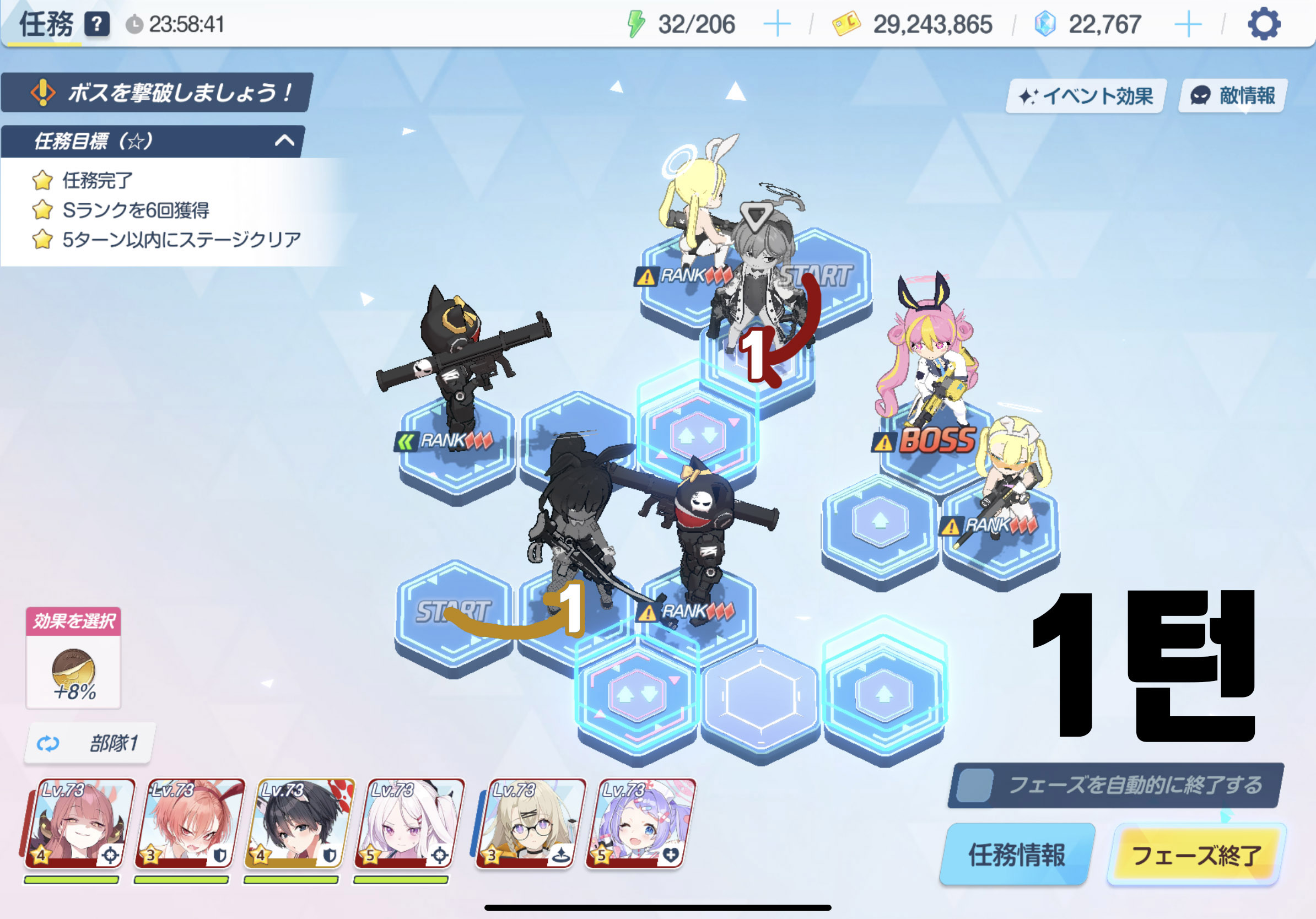 임무완료 / 전투 S랭크 6회 / 5턴 내에 스테이지 클리어