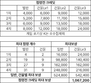 크레딧 수급 방법은 건물 업글과 발판 점령이 있습니다.