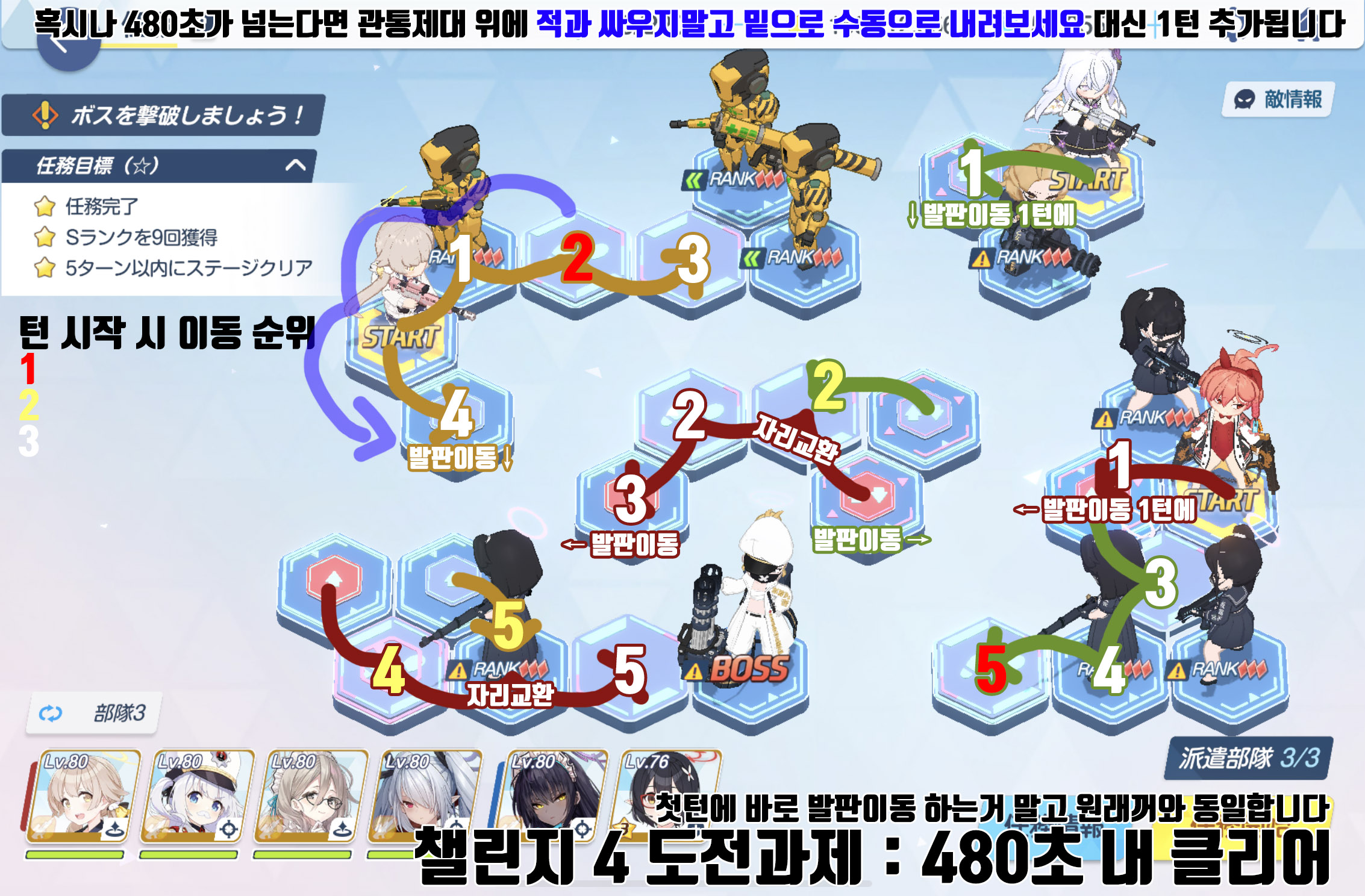 만약 불안하시면 관통소대를 2번까지만 갔다가 3번은 가지않고 되돌아와서 4번으로 가서 발판이동 후 5번으로 가면 전투를 한번 줄일 수 있습니다. 대신 1턴이 늘어납니다. (반투명 파랑루트)
