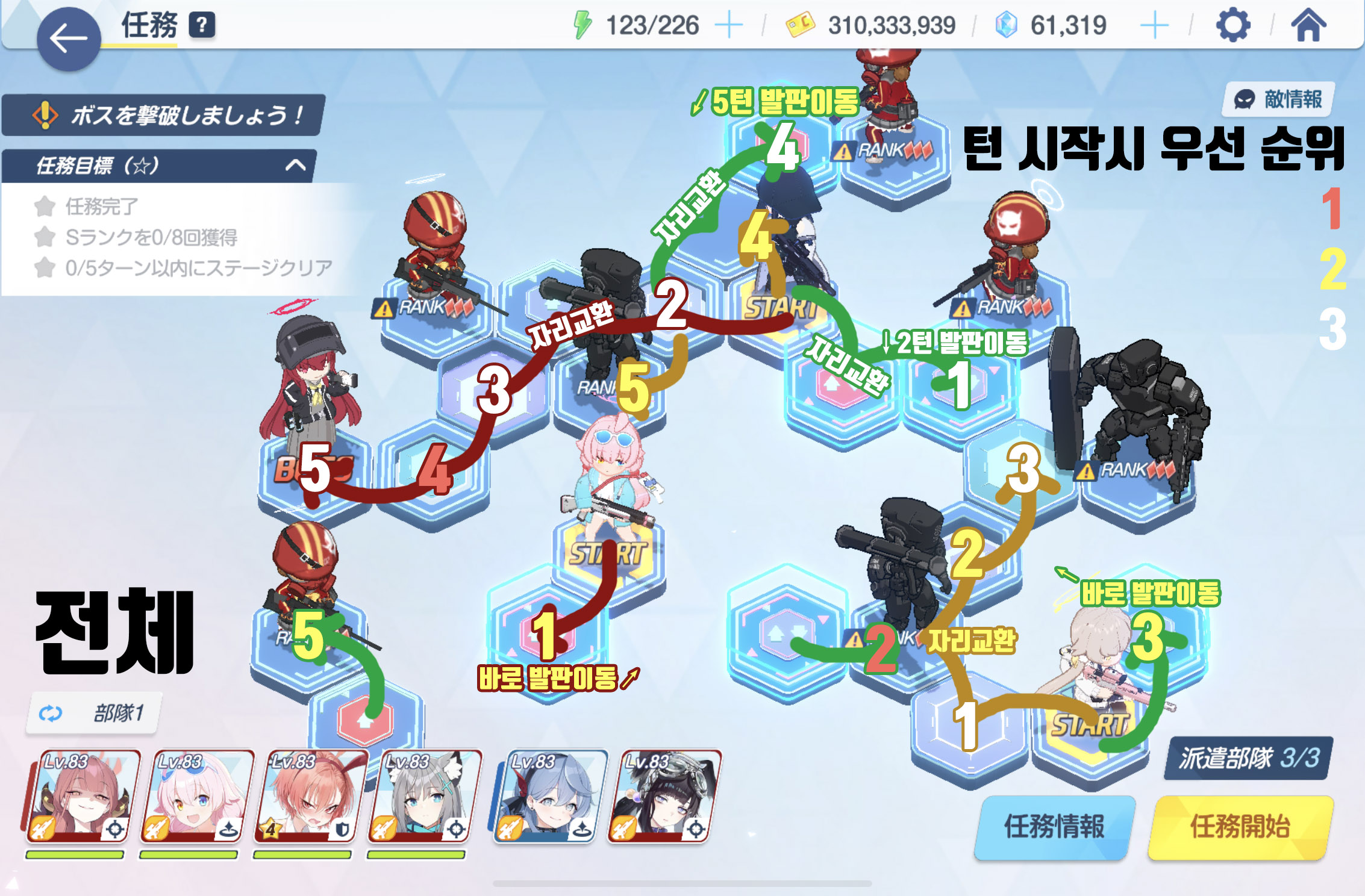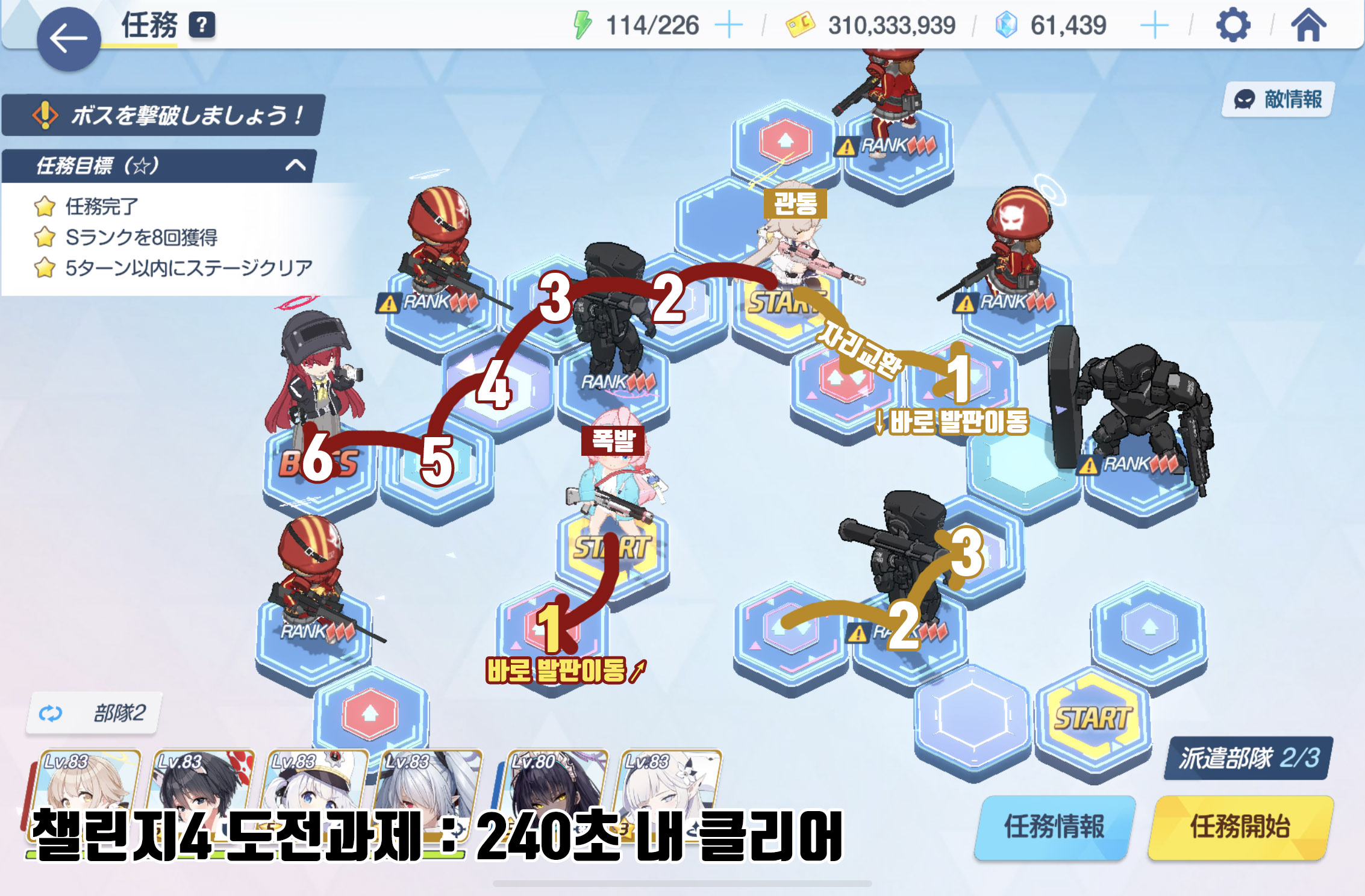 임무완료 / 전투 S랭크 8회 / 5턴 내에 스테이지 클리어