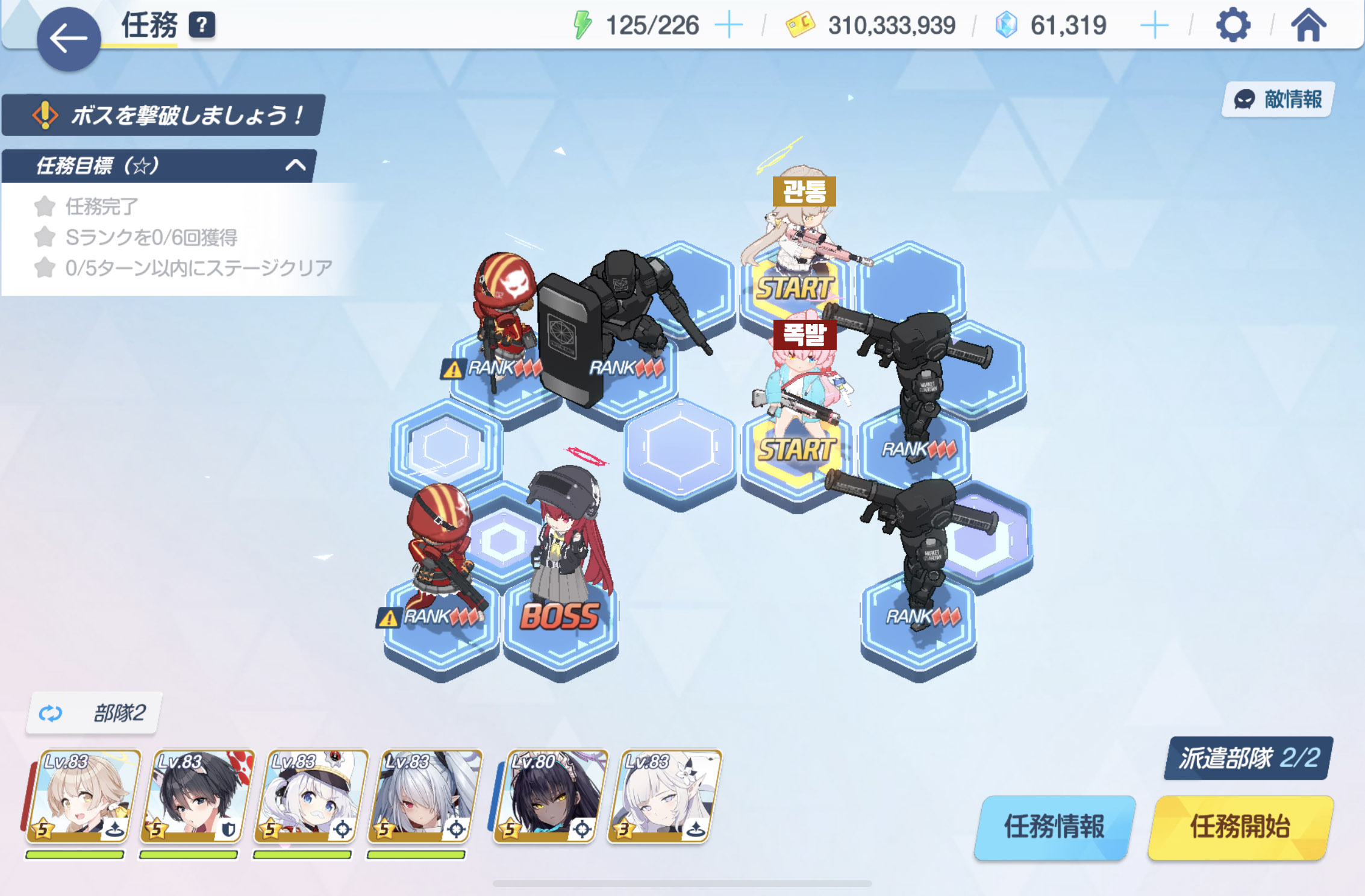 임무완료 / 전투 S랭크 6회 / 5턴 내에 스테이지 클리어