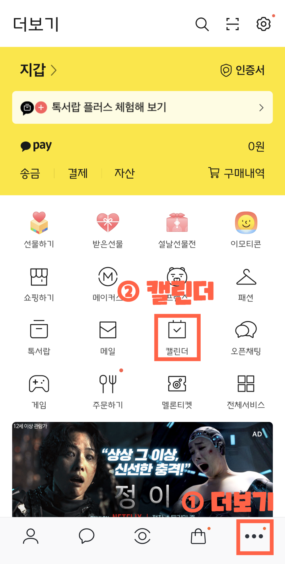 카카오톡을 켜서 더보기를 누르고 캘린더를 켜줍니다.
