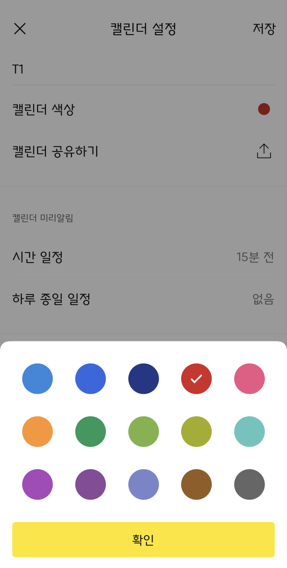 캘린더 색상을 눌러서 15가지 색상 중 하나로 선택하면됩니다.