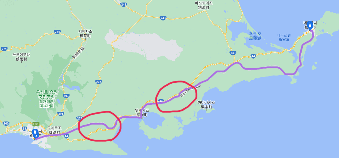 보라색이 네무로 선입니다. 빨간색으로 표시한 구역 중에 오른쪽인지 왼쪽인지