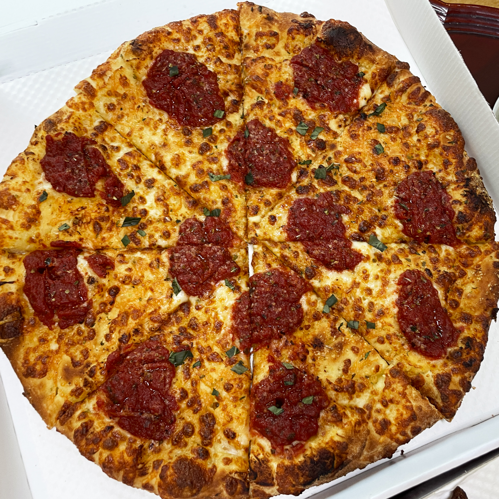 기본 치즈베이스에 토마토소스가 군데군데 뭉쳐져 있습니다.