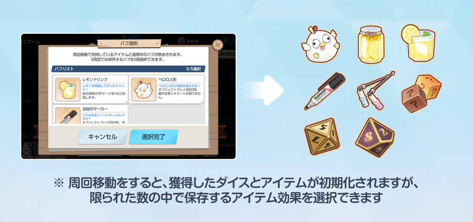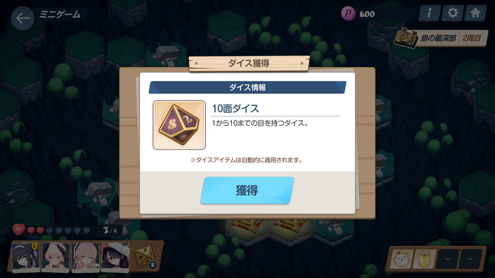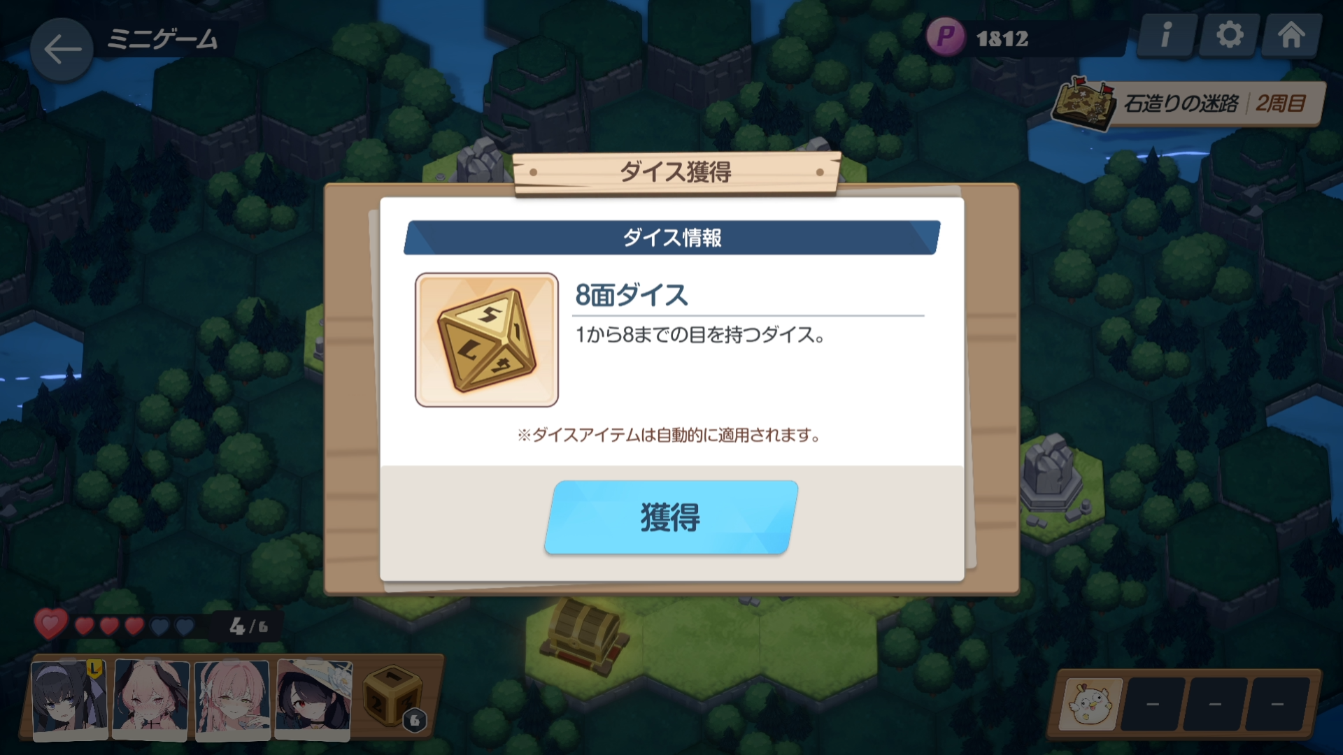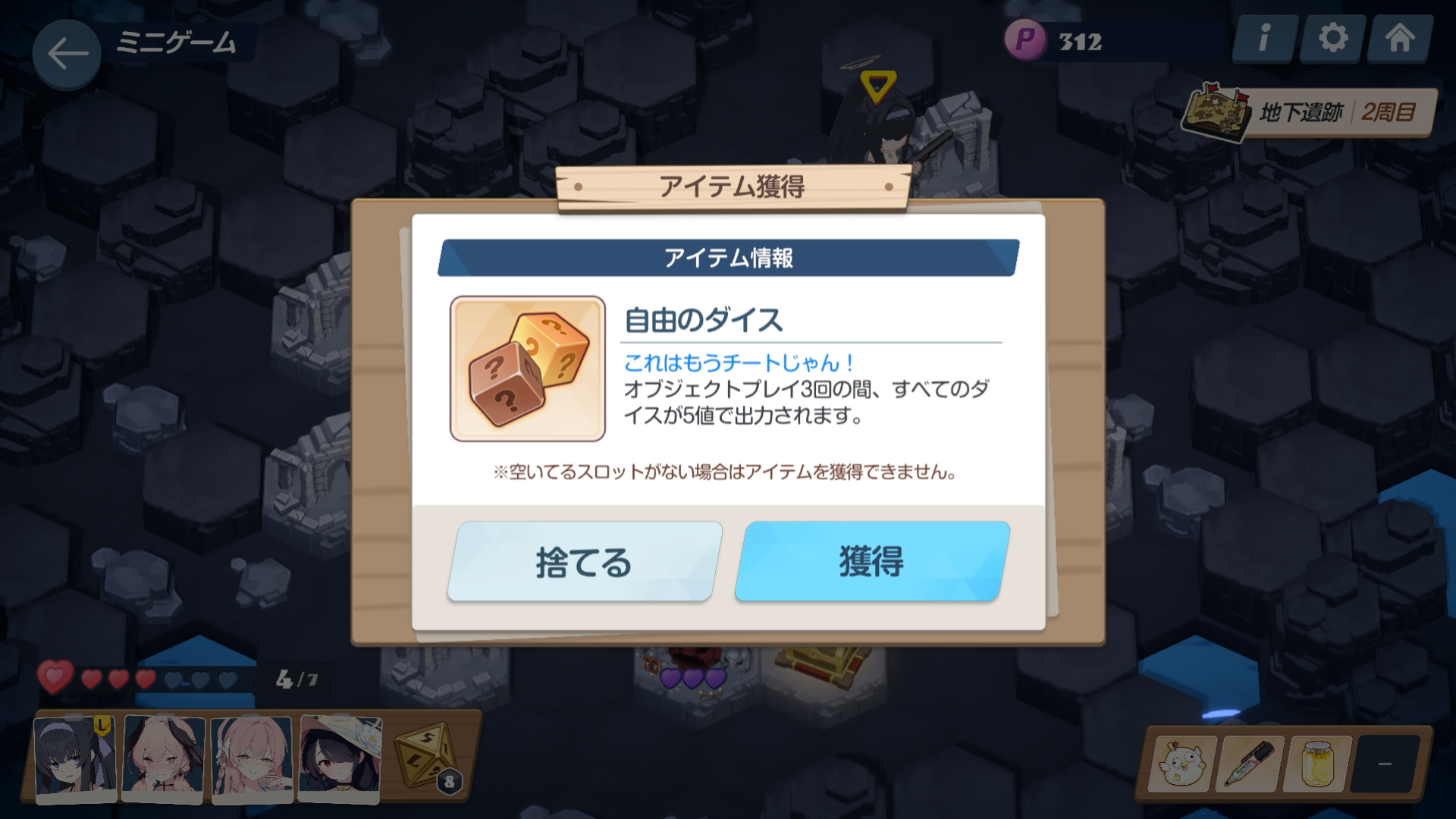 선택지를 고르고 그에 맞는 주사위 눈금이 이상으로 나오면 아이템을 얻을 수 있습니다.