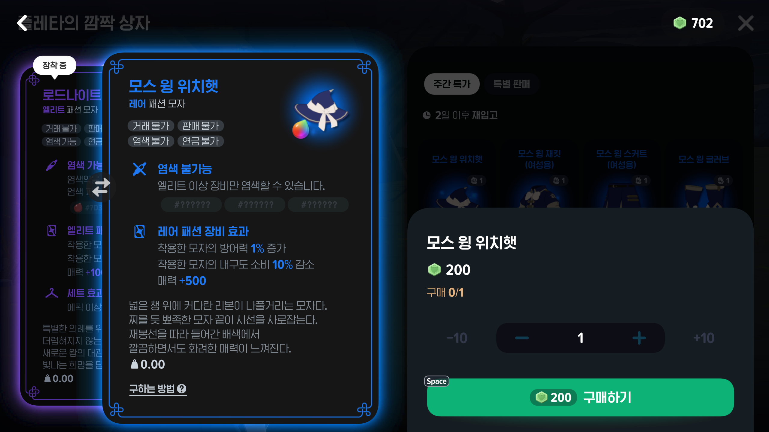 모스 윙 옷들은 전부 색상 랜덤이구요.